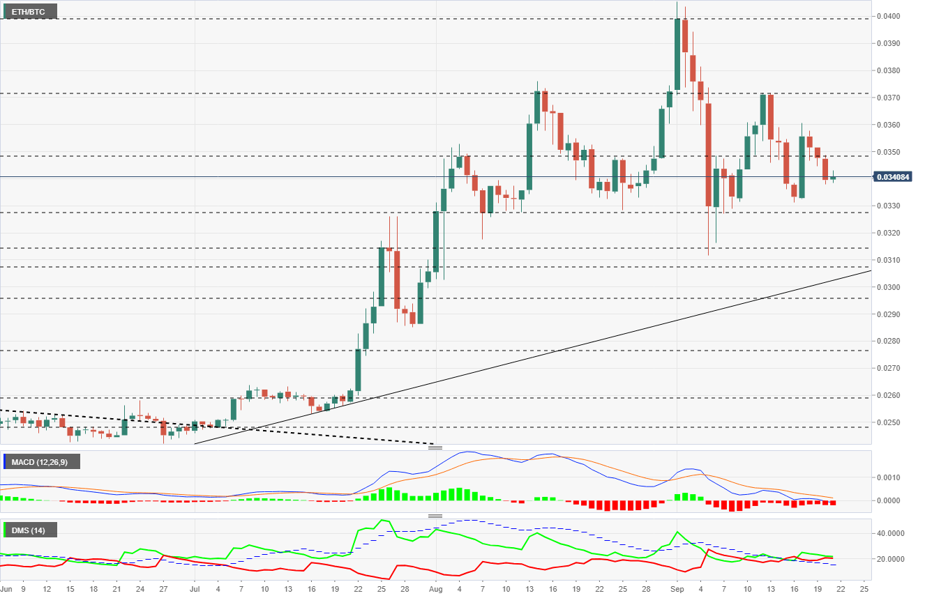 The ETH/BTC pair is currently trading at the price level of 0.0341, and for the first time in three sessions is moving upwards. ETH/BTC is following a sequence of decreasing highs, although the support zone is showing strength to hold above the 0.032 level.