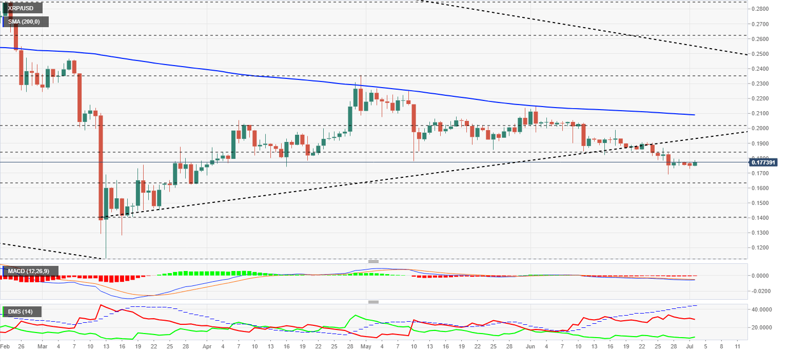 The XRP/USD pair is currently trading at the price level of $0.1773 and is up 1.40%. The Ripple's situation is critical as it is moving through a zone that lacks clear support and could lead to massive sales to reach $0.14 first and $0.10 later. Only above the $0.195 level would the danger disappear.