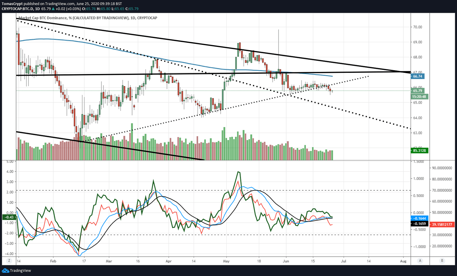 The second key event of the last hours is the loss of crucial supports in the Bitcoin dominance chart. After several days of holding above the 66% market share level, the mark is now at 65.79% and has as its first short term target at the 64.5% level.