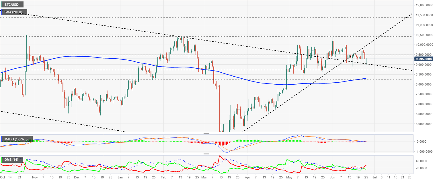 The BTC/USD pair is currently trading at the $9295 price level after dropping below the $9000 mark. The BTC/USD chart moves within an expansive triangle scenario.