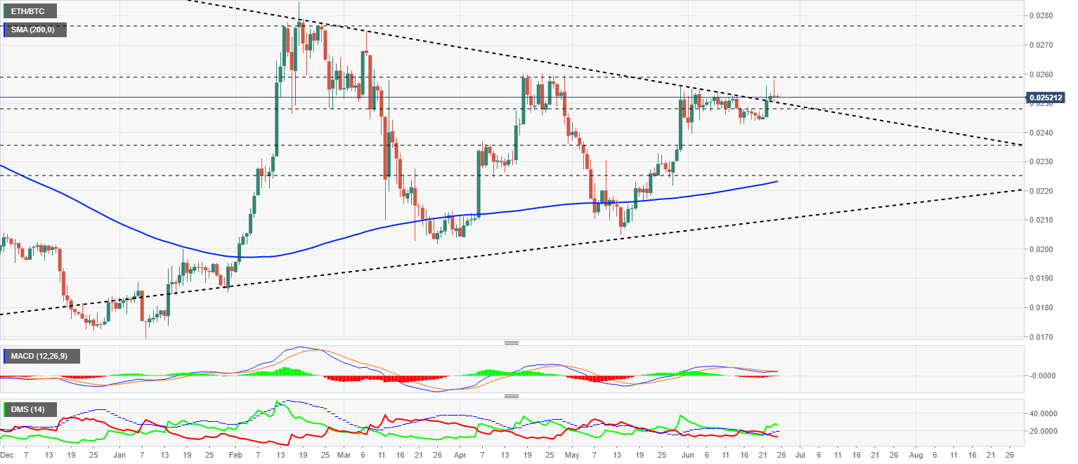 The first of these key indicators is the ETH/BTC chart, which shows the pair breaking out of the long-term downward trend line that has held the price since February 2019.