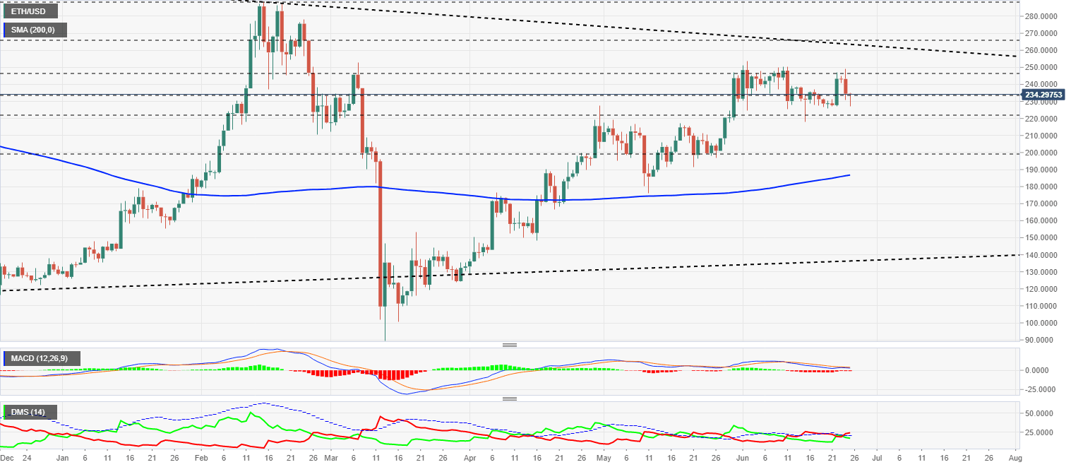 The ETH/USD pair is currently trading at $234.3, leaving an ugly bearish return structure on the daily chart, which, although incomplete, puts the price at risk in the short term. The current price range allows for prices in the $220 zone without this implying a change towards a bearish scenario.