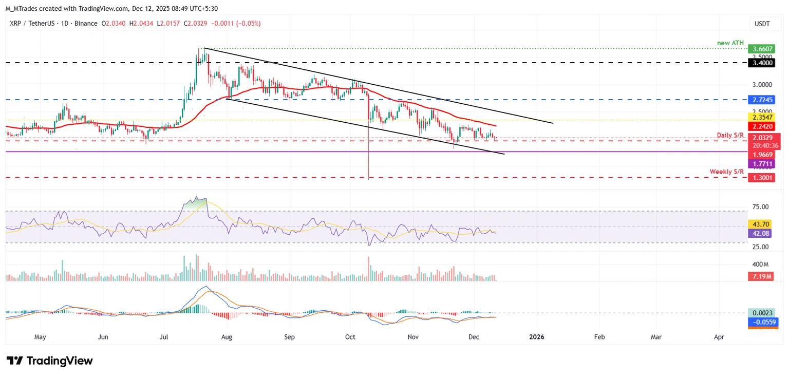 - XRP is holding support near the $1.96 daily level, hinting at a potential rebound.