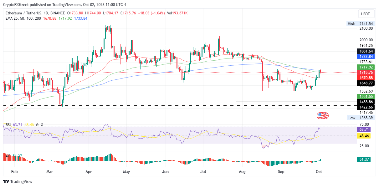 Ethereum (ETH) price is correcting, recording an extended red candlestick bar that is cutting down on all the ground covered in the October 1 surge. It comes after a rejection from the 200-day EMA at $1,733 and a flip of the 100-day EMA from a support floor to a resistance level at $1,717.