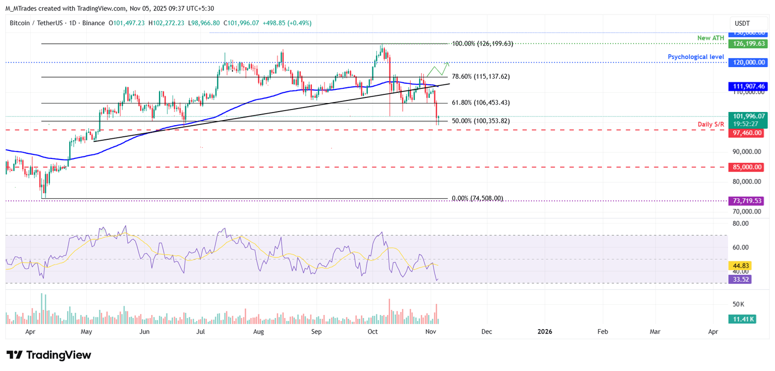 Bitcoin price faced rejection around its previously broken trendline on Monday and declined 8.18% until the next day, retesting the 50% retracement level at $100,353. At the time of writing on Wednesday, BTC is finding support around $100,353 and trading slightly above $102,000.