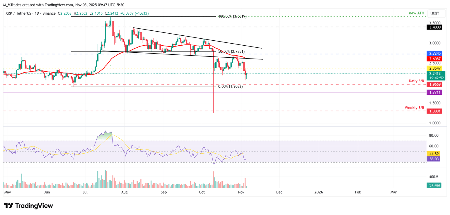 XRP price started the week on a negative note, declining by more than 12% through Tuesday after being rejected around the 50-day EMA at $2.60 on Monday. At the time of writing on Wednesday, XRP hovers at around $2.24.