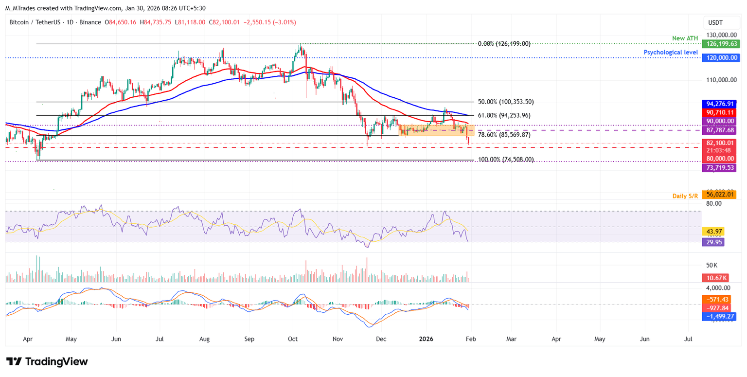 If BTC continues its downward trend, it could extend the decline toward the November lows of $80,600. A decisive close below this level could extend the fall toward the April 7 low (2025 yearly lows) at $74,508.