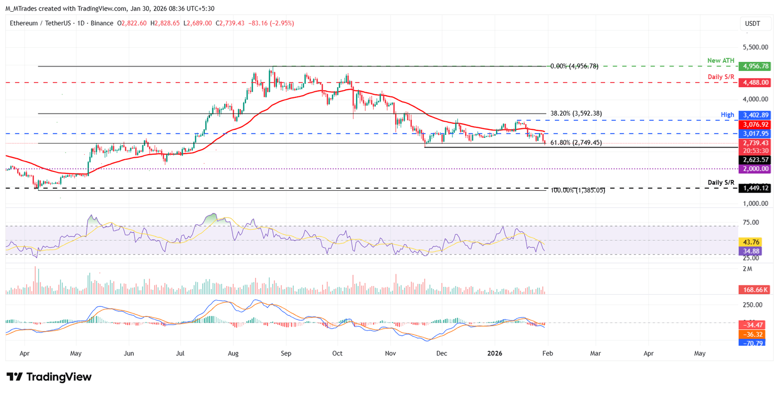 - Ethereum is edging below the key support at $2,749, a close below suggests a deeper correction.