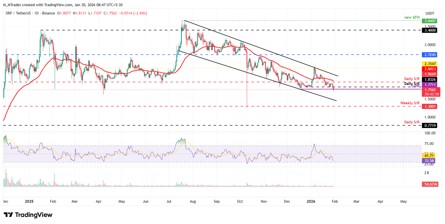XRP price failed to close above the daily resistance at $1.96 on Wednesday and declined 5.42% the next day, closing below the daily support at $1.83. As of Friday, XRP is trading down to $1.75, its lowest level since mid-October.