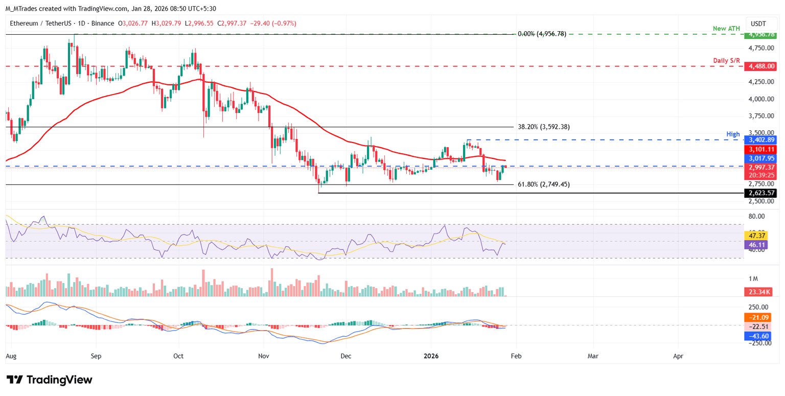 Ethereum price started the week on a positive note, recovering 7.62% by Tuesday after a massive 14.22% correction the previous week. As of Wednesday, ETH is nearing the key resistance level at $3,017.