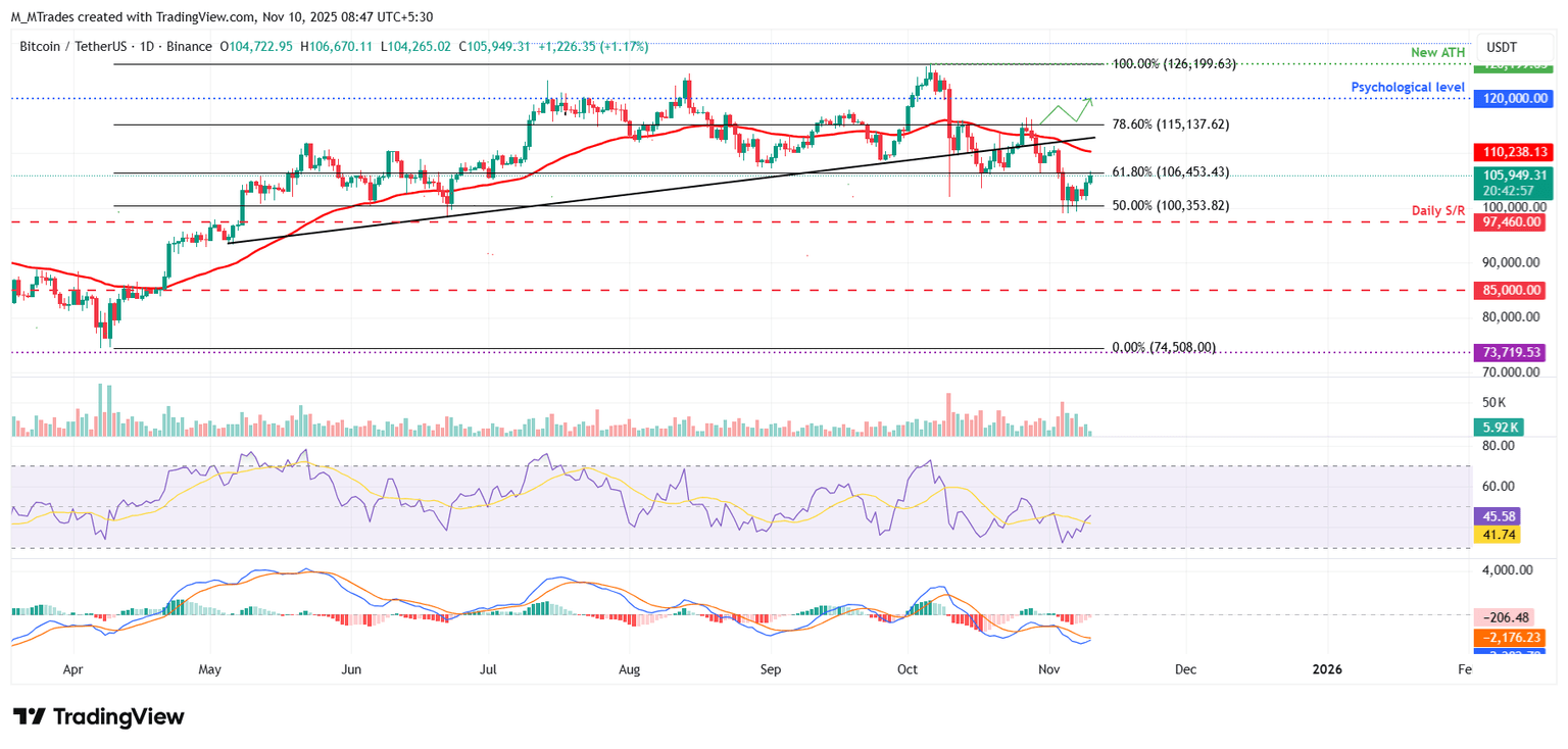Bitcoin's price found support around the 50% retracement at $100,353 on November 4 and retested it over the next four days. On Sunday, BTC rebounded 2.36%. At the time of writing on Monday, BTC is extending its recovery trade at $105,900.