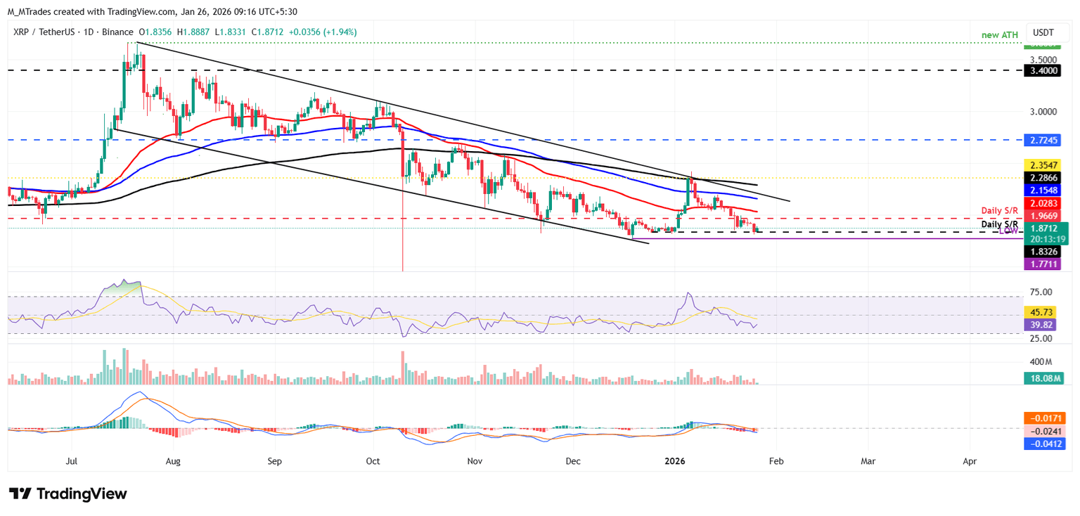 XRP price has corrected by more than 12% over the last three weeks since early January, retesting the daily support at $1.83 on Sunday. At the time of writing on Monday, XRP is rebounding slightly, trading around $1.87.