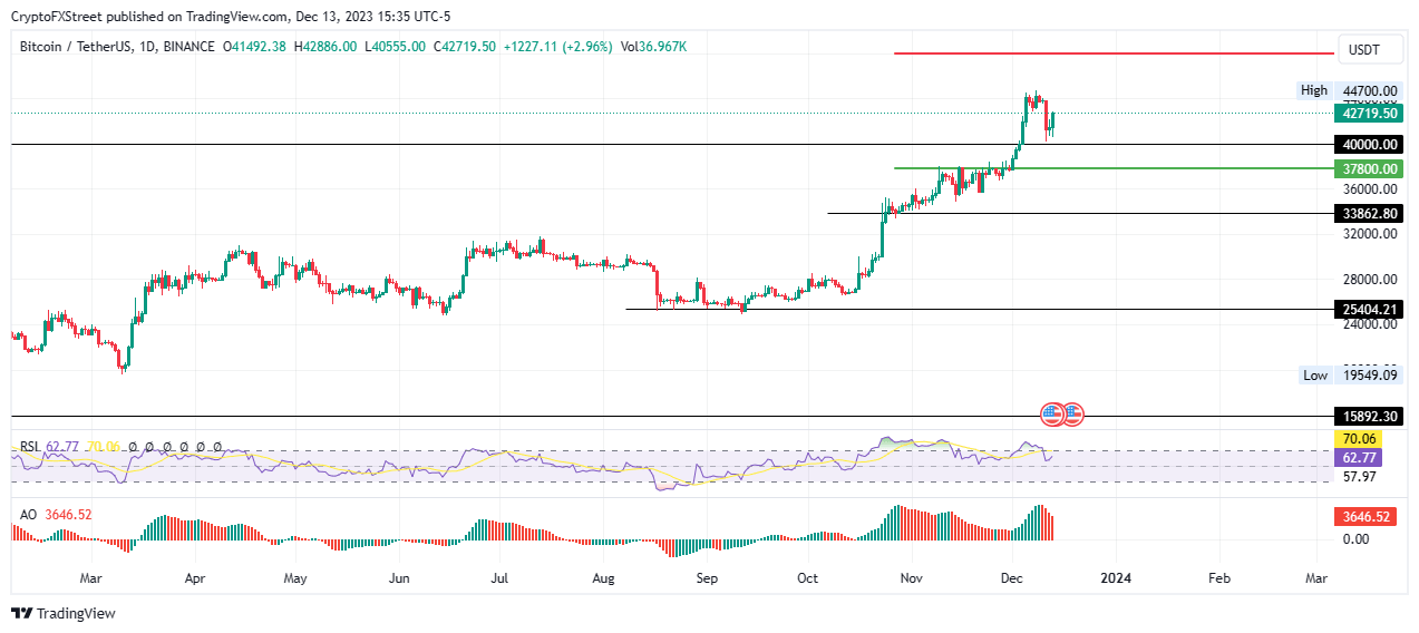 Increased buying pressure could see Bitcoin price pull north, potentially clearing the range high at $44,700 or higher, tagging $45,000, 6% above current levels. In a highly bullish case, BTC could extend to the $48,000 psychological level. Such a move would constitute a 12% climb above the current level.