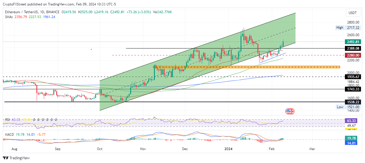 Ethereum (ETH) price is on a sustained uptrend, and could extend the climb past $2,600 to tag $2,717, levels last tested on January 12. This would constitute a 9% climb above current levels.