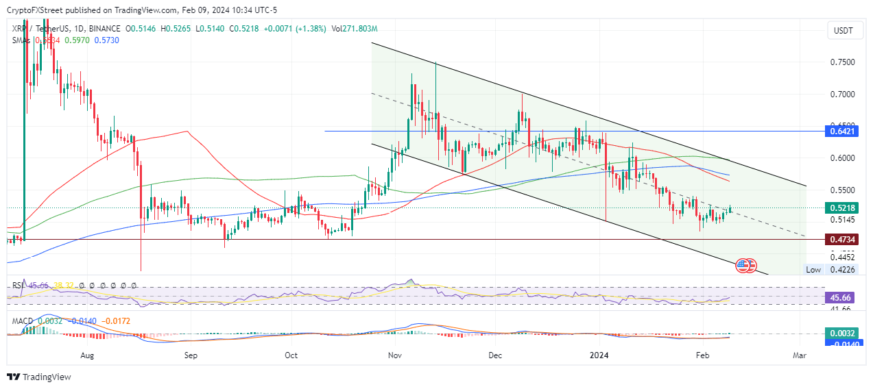 Ripple (XRP) price has broken above the midline of the descending parallel channel. With momentum rising, XRP price could extend the gains 5% to the $0.5500 level. In a highly bullish case, the price could extend the climb, shattering the 50, 200 and 100-day Simple Moving Averages (SMA) at $0.5633, $0.5730 and $0.5970, respectively. This could lay the path for XRP to hit the $0.6000 psychological level.