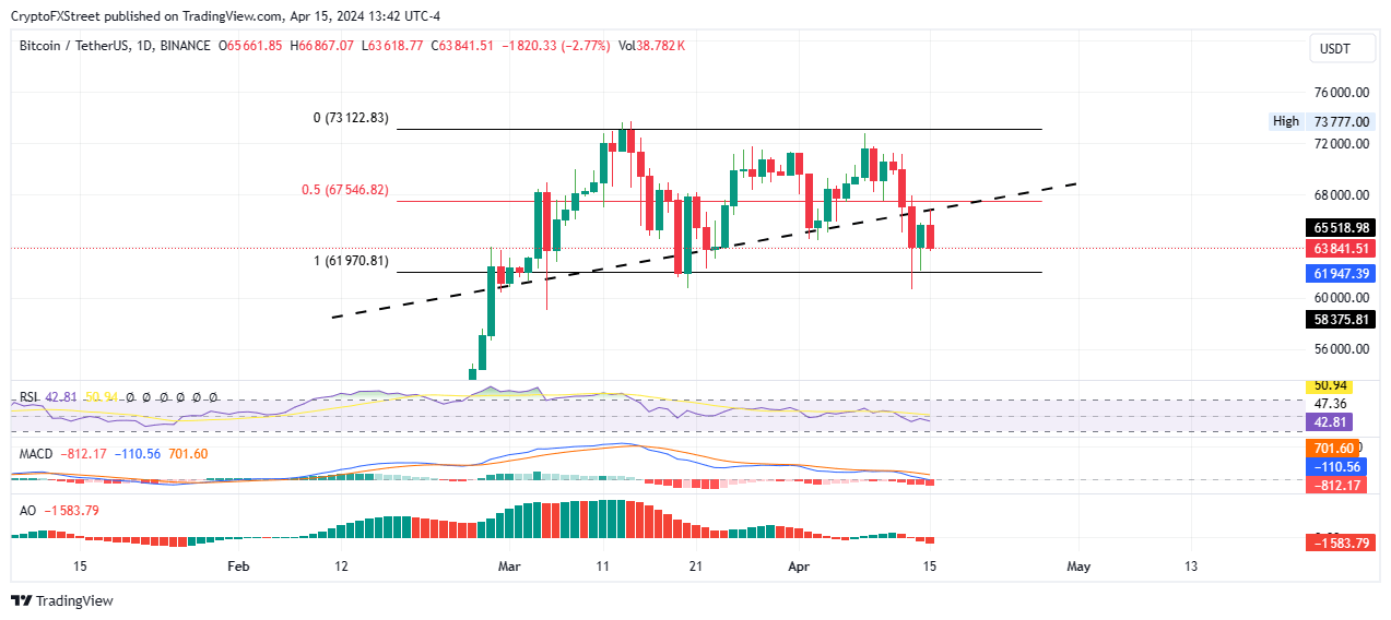 Bitcoin price downside momentum could have more play before the halving. The pioneer crypto remains below crucial support provided by the ascending trendline after a slip below three days ago. Stuck in the lower section of the market range between $61,970 and $73,122, where selling pressure climaxed and buying pressure peaked, respectively, the odds favor the bears.