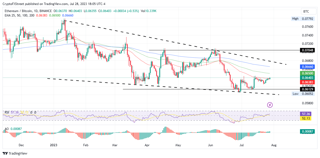 Ethereum (ETH) price is edging north against Bitcoin on the ETH/BTC 1-day chart after a progressive consolidation within a falling wedge pattern. Lower highs and lower lows characterize this bullish technical formation as bulls give way to the bears. As the price bounces from the lower boundary of the chart pattern, the right amount of buyer momentum could see ETH breakout and confirm the pattern.