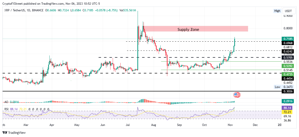 Conversely, with XRP being massively overbought, it is likely that the supply zone will hold as a resistance order block. The ensuing rejection could see Ripple price pull south, slipping through the $0.6968 support level and testing the $0.6242 support with bulls seeking rejuvenation. Another evaluation will be required at this point to determine the next step for XRP, considering the prevailing bullish outlook in the broader market.