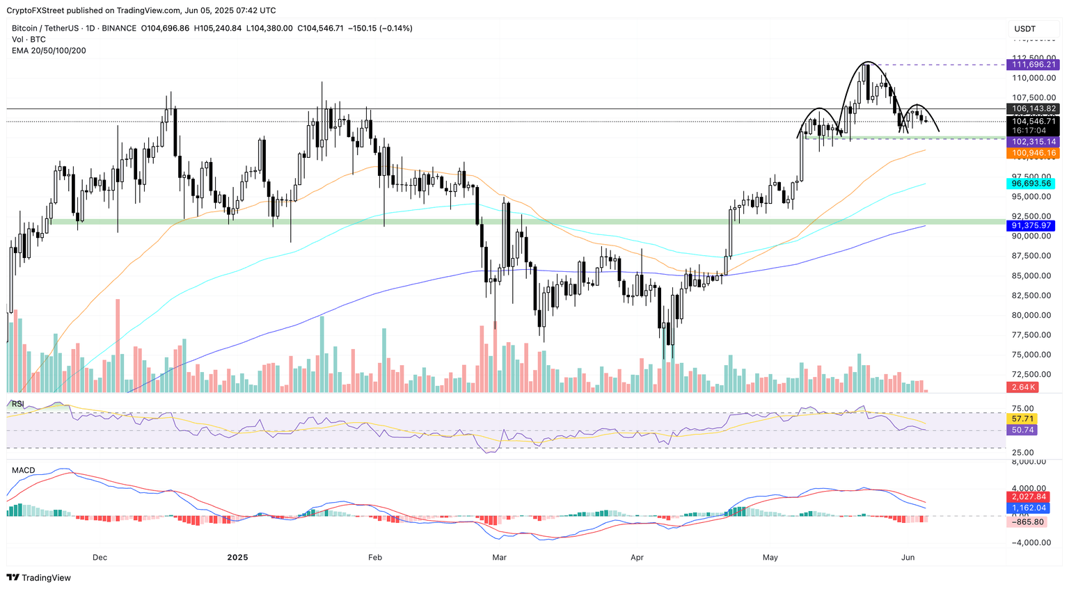 In case of extended pullback, the immediate support lies at the 50-day Exponential Moving Average (EMA) at $100,946.