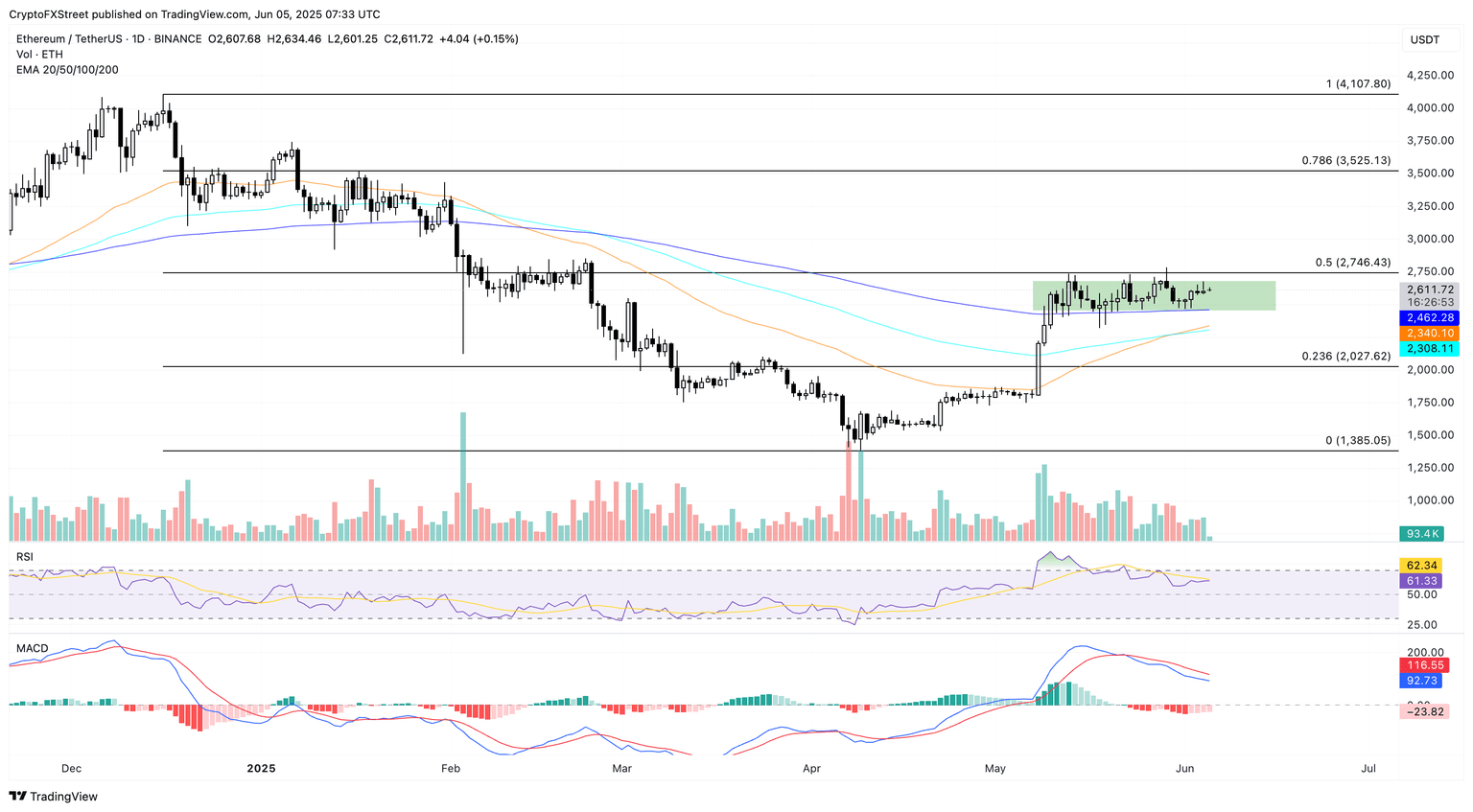 - Ethereum consolidates within a three-week-long range-bound movement, trading near $2,600.