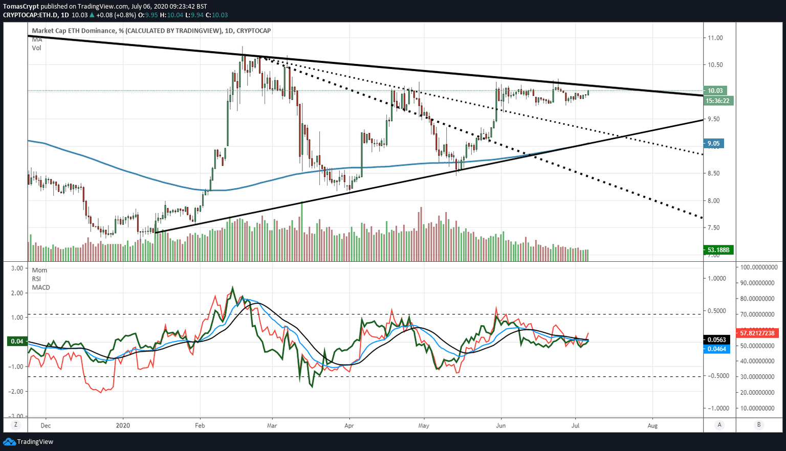 Ethereum moves at the 10.00 level of dominance of the whole crypto market and approaches the major resistance at 10.12 again. This resistance is the second level to be watched by the analysts who follow this war for dominance between Bitcoin and Ethereum.