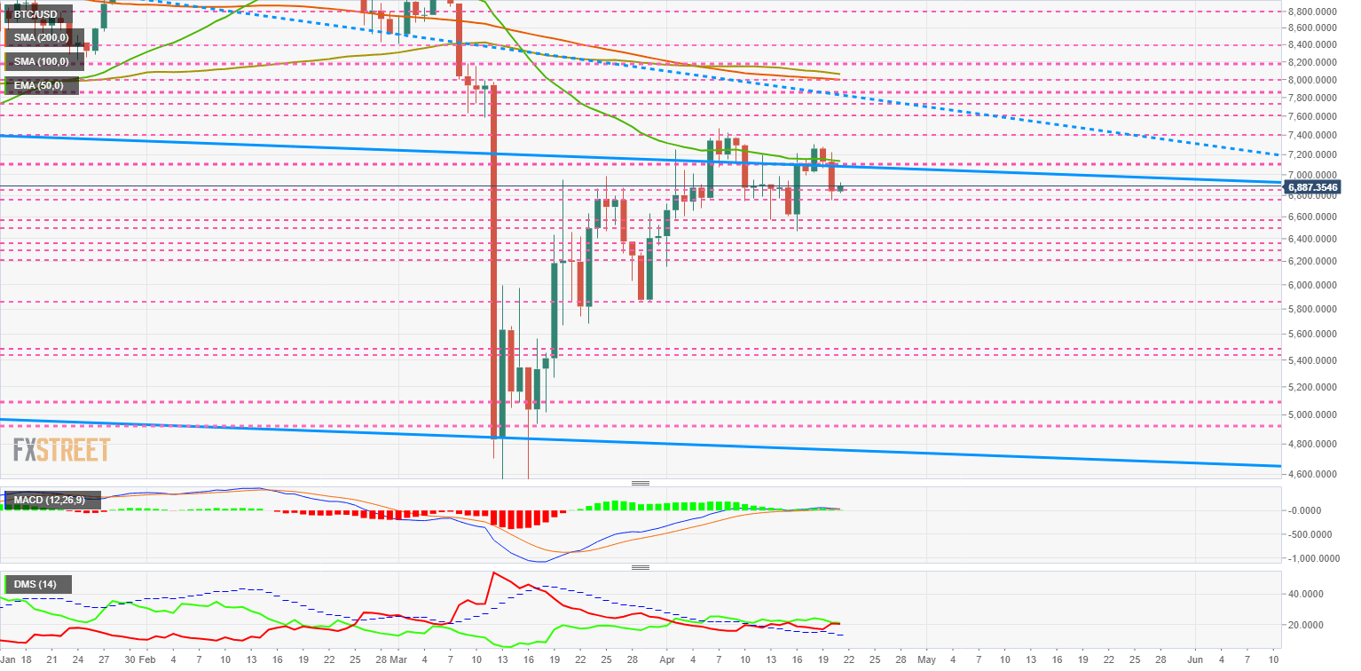 The BTC/USD pair is currently trading at the $6885 price level and is moving in the first support level below the long-term bearish channel ceiling. Moving averages continue to be around $8000, indicating where the natural point of attraction for BTC/USD price lies.