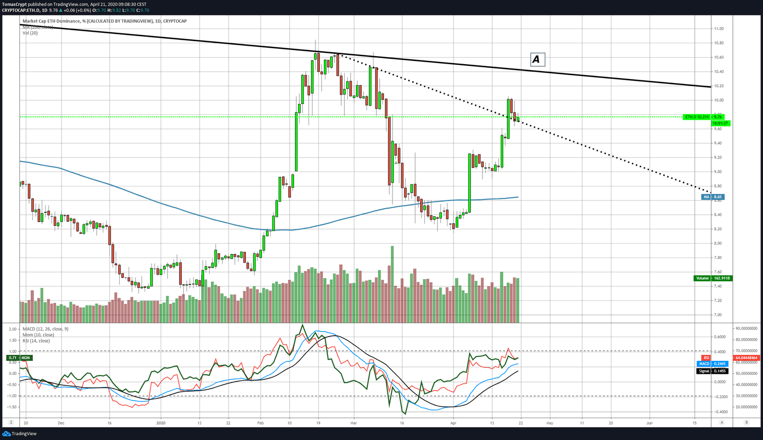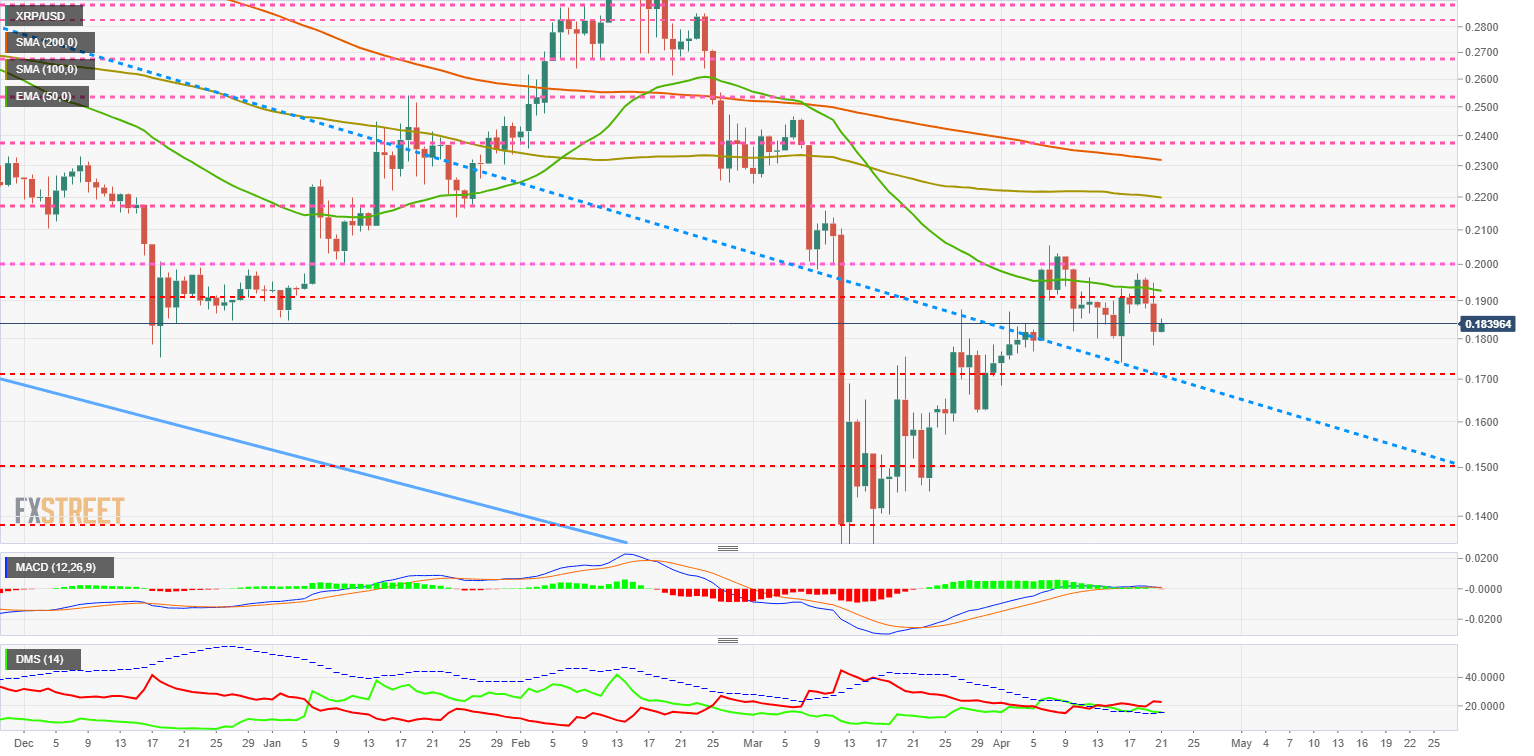 The XRP/USD pair is currently trading at $0.1839 and remains in the sideways range that began on April 6th. The main moving averages are still pointing down but with smooth profiles.