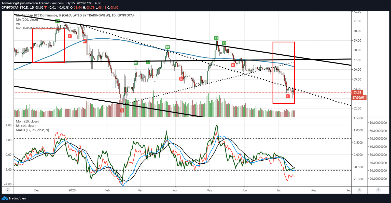 In this chart, we can see that the 200-day simple moving average has been rising since the beginning of the year. The index is currently trading at 0.07529, following a narrow upward sloping channel. Above the 0.078 level, this group of Altcoins would rise very sharply against the Bitcoin, with the 0.0856 level as the first target.
