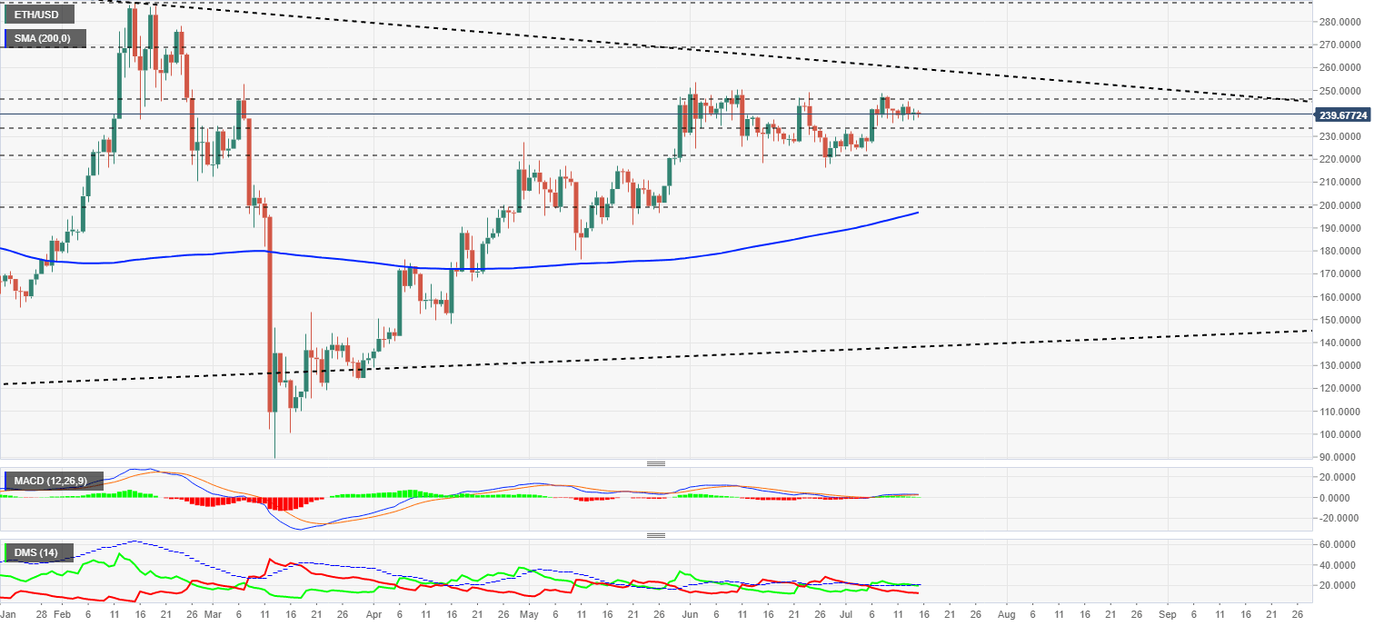 The ETH/USD pair is currently trading at $239 and again reflects the lack of direction among market leaders. The 200-day simple moving average is exacerbating the bullish profile and is already moving at the $200 level.