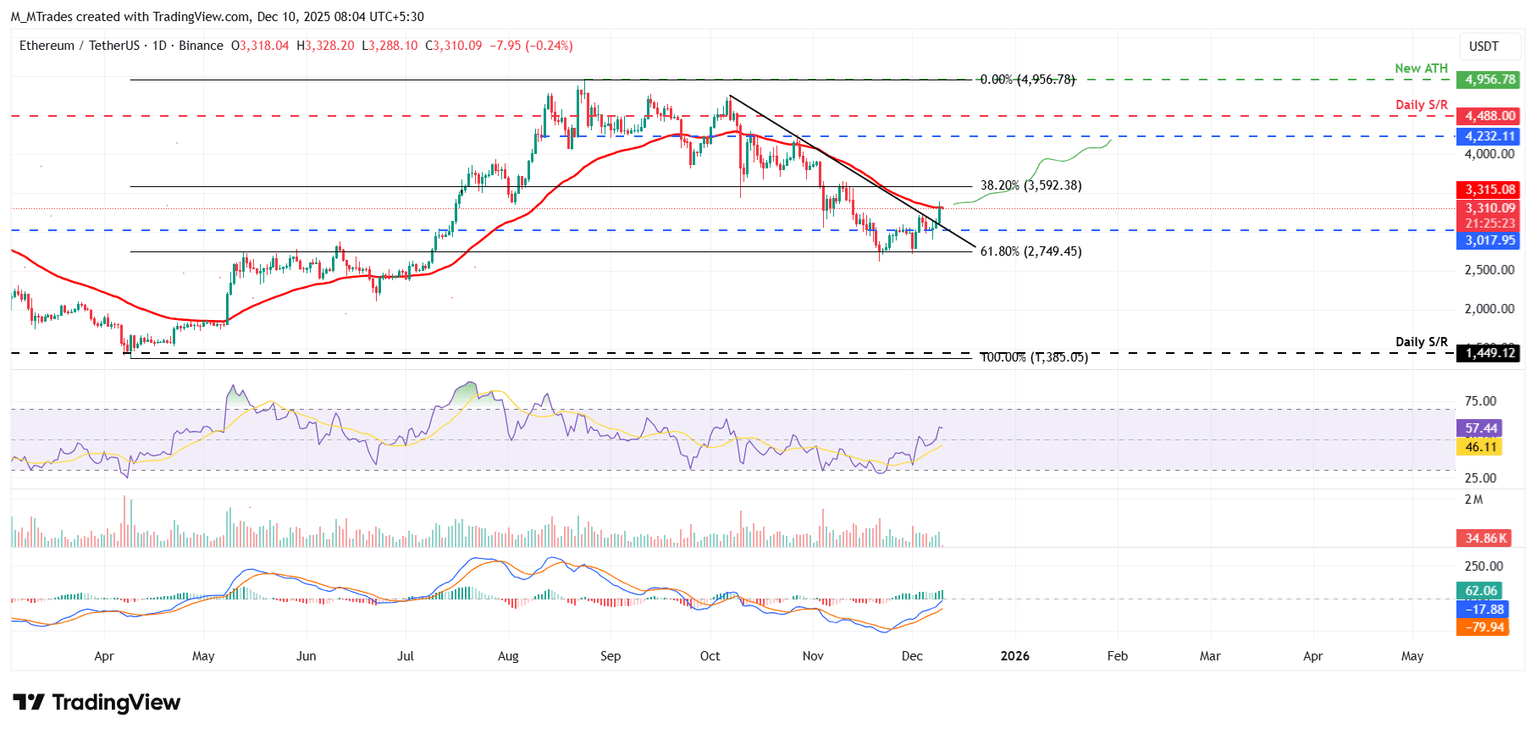 Ethereum price broke above the descending trendline (drawn by joining multiple highs since October 7) on Tuesday and rose 6.21%. At the time of writing on Wednesday, it hovers around the 50-day Exponential Moving Average (EMA) at $3,315.