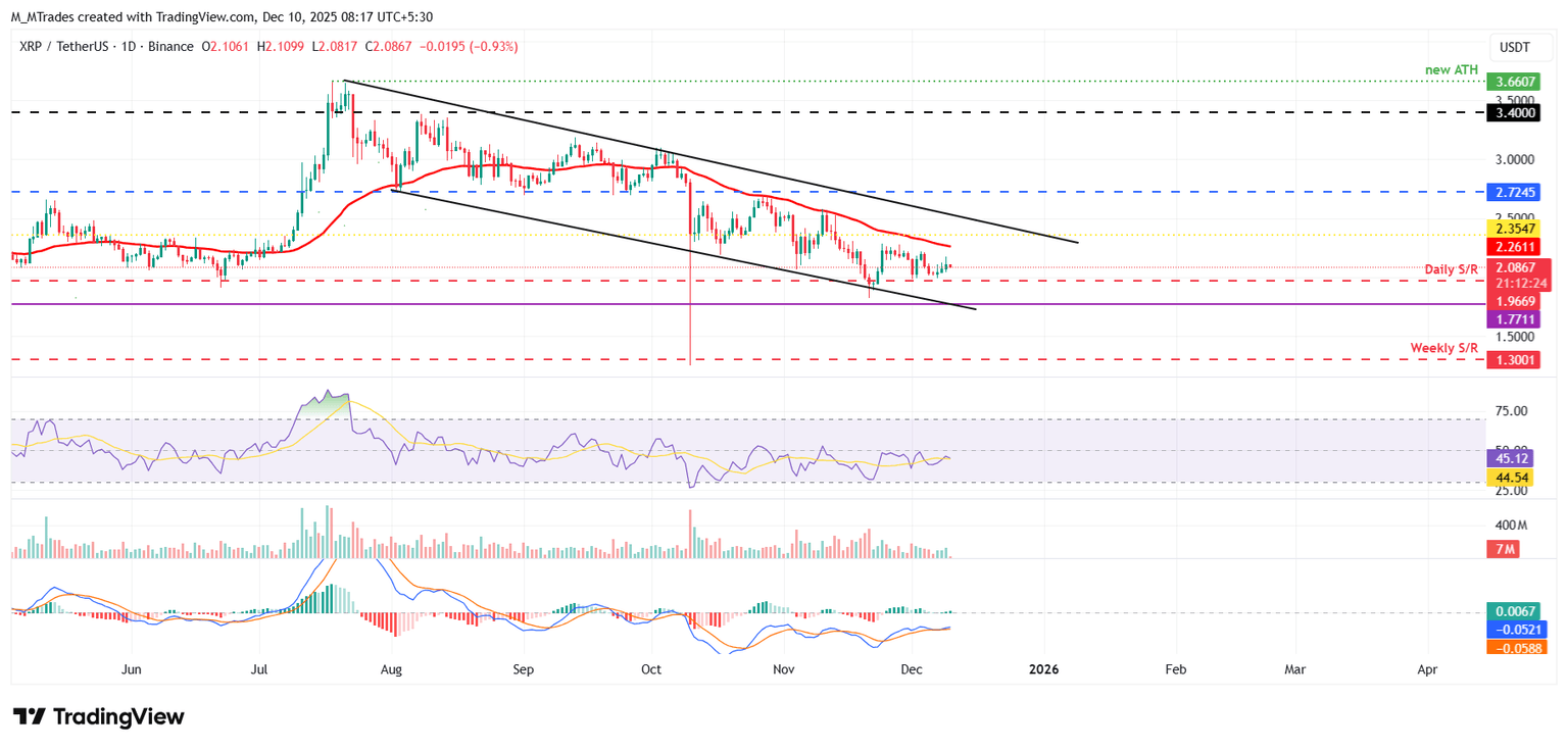 - XRP hovers around $2.08 after its recent rally, finding support at the $1.96 daily level.