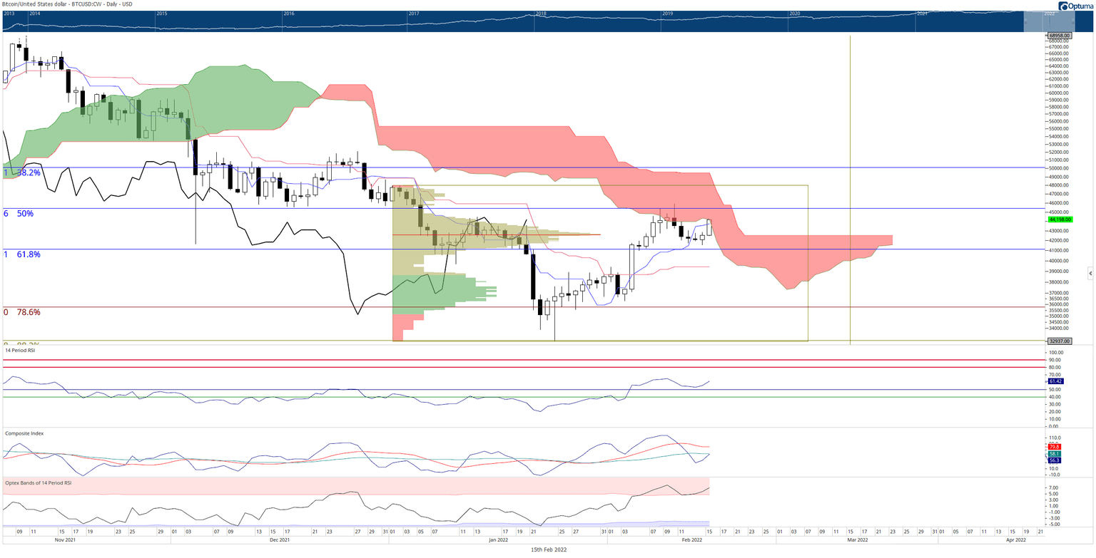 Looking forward to February 20, the top of the Ichimoku Cloud (Senkou Span B) falls to $42,500 from the current $49,500. As a result, it is increasingly likely that Bitcoin could trade sideways between the 61.8% Fibonacci retracement at $41,000 and the 2022 Volume Point Of Control at $43,000 until February 20 before positioning for an Ideal Bullish Ichimoku Breakout above the Cloud.