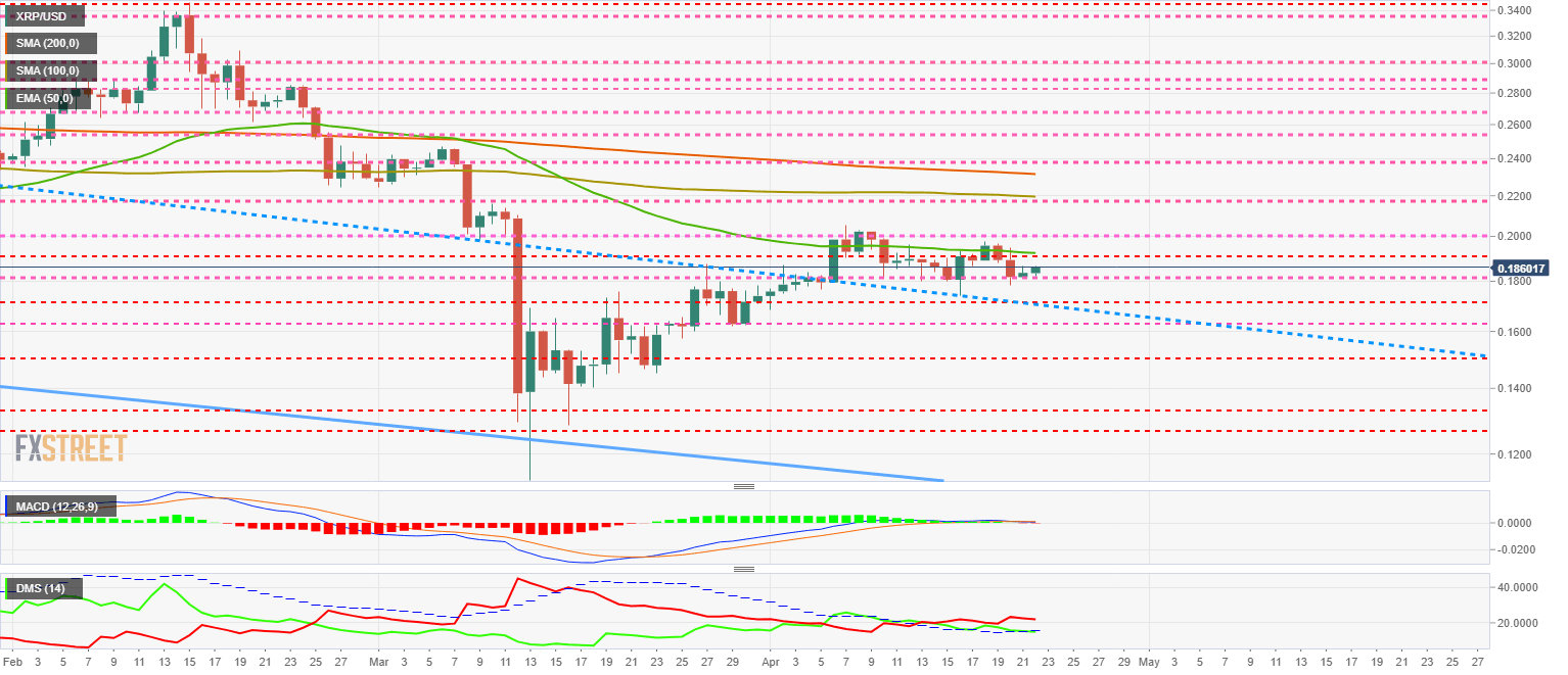 The XRP/USD pair is currently trading at a price level of $0.186 and is pointing to the current positive tone in the crypto market. The main moving averages continue to slide down, complicating the upward development for the Ripple Ltd. token.