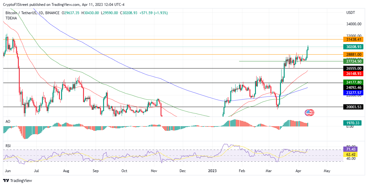 Bitcoin price breached the $30,000 level on April 11 to exchange hands for $30,208 at the time of writing. The king crypto boasts four consecutive green bars on the daily chart as bulls take the lead. However, based on the position of the Relative Strength Index (RSI) at 71, it appears BTC is overbought and a correction may be due.