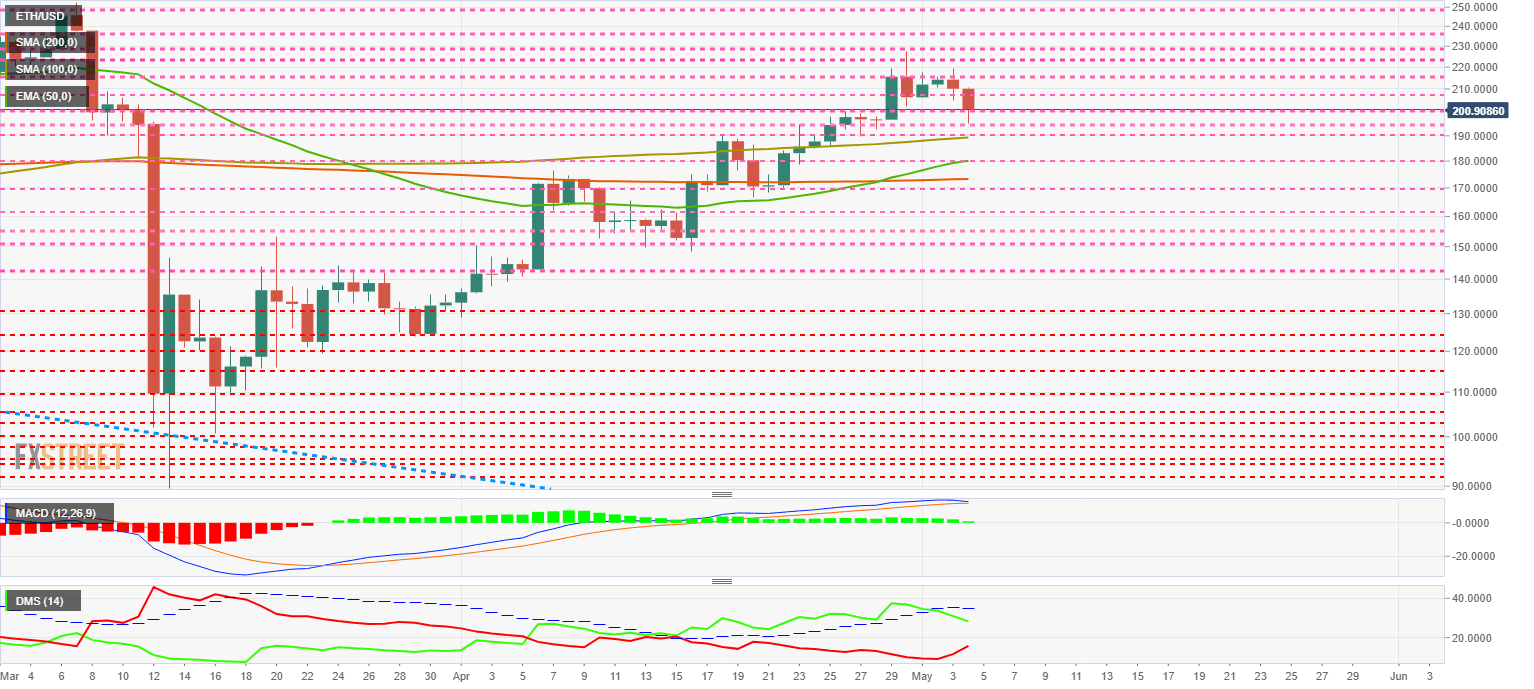 The ETH/USD pair is currently trading at $199.9 and is losing its psychological support level at $200.