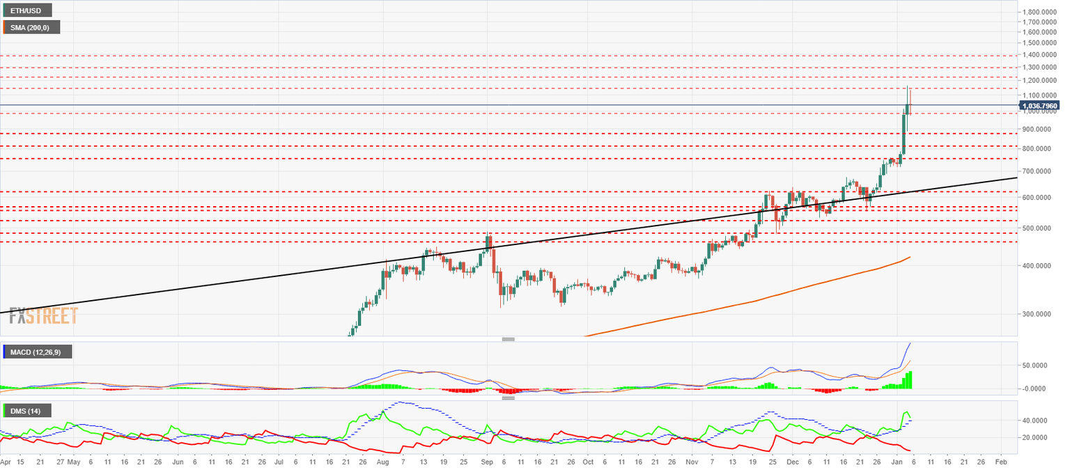 The ETH/USD pair is currently trading at $1,036. All eyes are on the historic high of $1,400, but we should not ignore the danger warning provided by the 200-day simple moving average, which is located in the $440 zone, well below the current price.