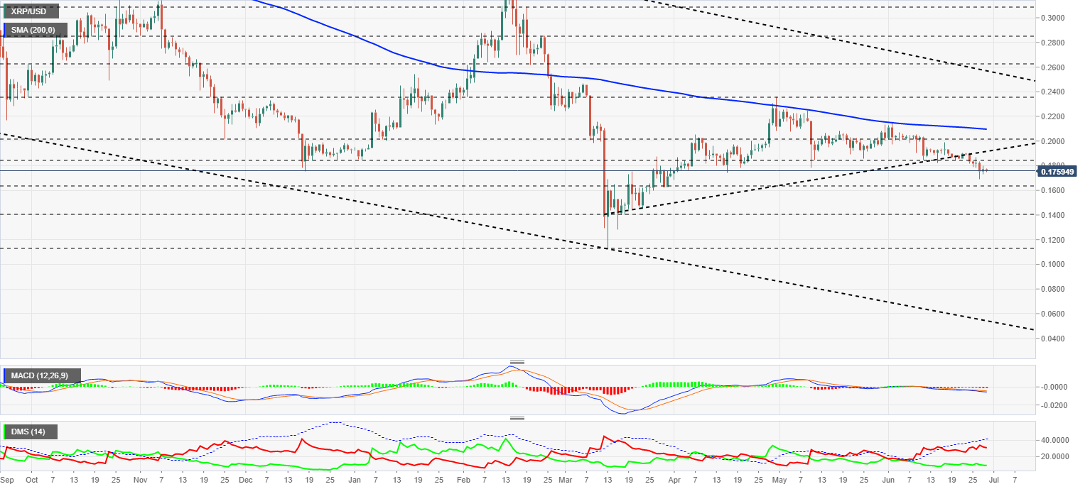 The XRP/USD pair is currently trading at $0.1759 and consolidates the new bearish scenario it entered early last week. The Ripple is technically in a very fragile situation, lacking support and without any expectations of improvement.