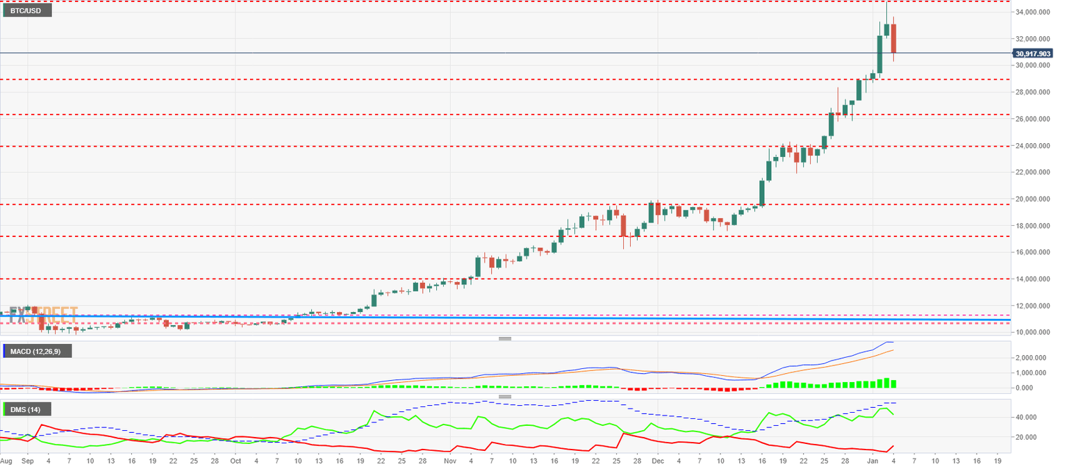 The BTC/USD pair is currently trading at $30,931 and is temporarily moving away from the all-time high of $34,800. The strong upward momentum maintained by Bitcoin over the past few weeks has left much room for support below the current price.
