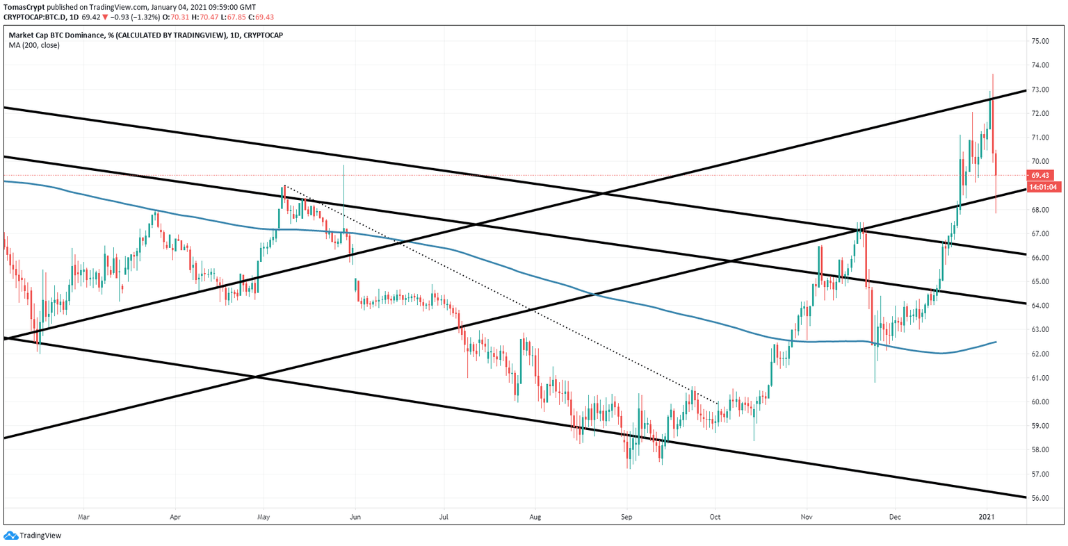 The Bitcoin dominance chart is showing a significant decline from the 73.64 level (relative peak.) Bitcoin dominance is now at around 69.32.