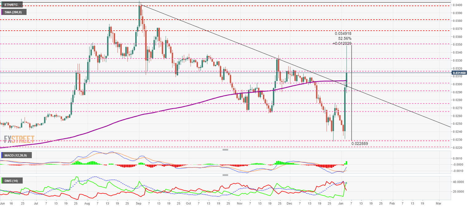 The substantial rise in the price of the Ethereum in the last two sessions leaves significant changes in the ETH/BTC pair. After a significant downward trend in late summer, the Ethereum/Bitcoin ratio increased by 52.56% in two sessions and is now back at 0.030.
