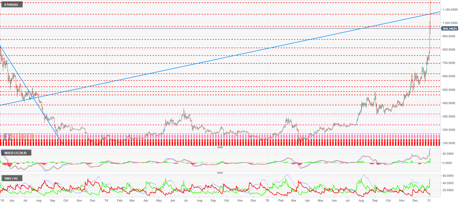 The ETH/USD pair is currently trading at $958.34 after reaching $1,166 at the Asian session.