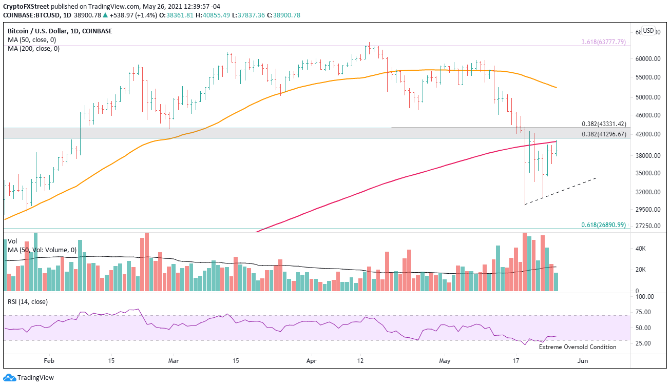 Bitcoin price is trading just below the 200-day SMA, and the rebound from the May 19 low has been reluctant, featuring lower volume on up days. The strategically important moving average is only the first credible resistance for BTC to overcome.