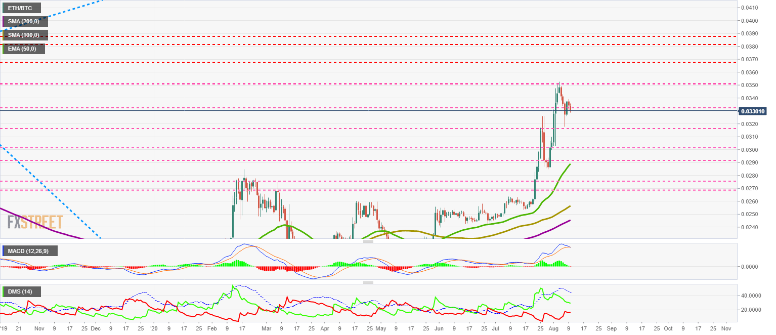 ETH/BTC pair is currently trading at the price level of 0.033 and is losing price support at 0.0335.
