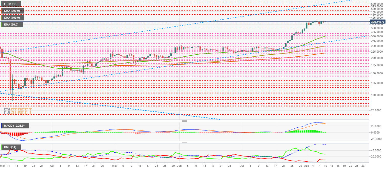 The DMI on the daily chart shows the bulls losing strength gradually, although the leadership of the bought side is not at risk because the bears are not interested in disputing the dominance of ETH/USD.