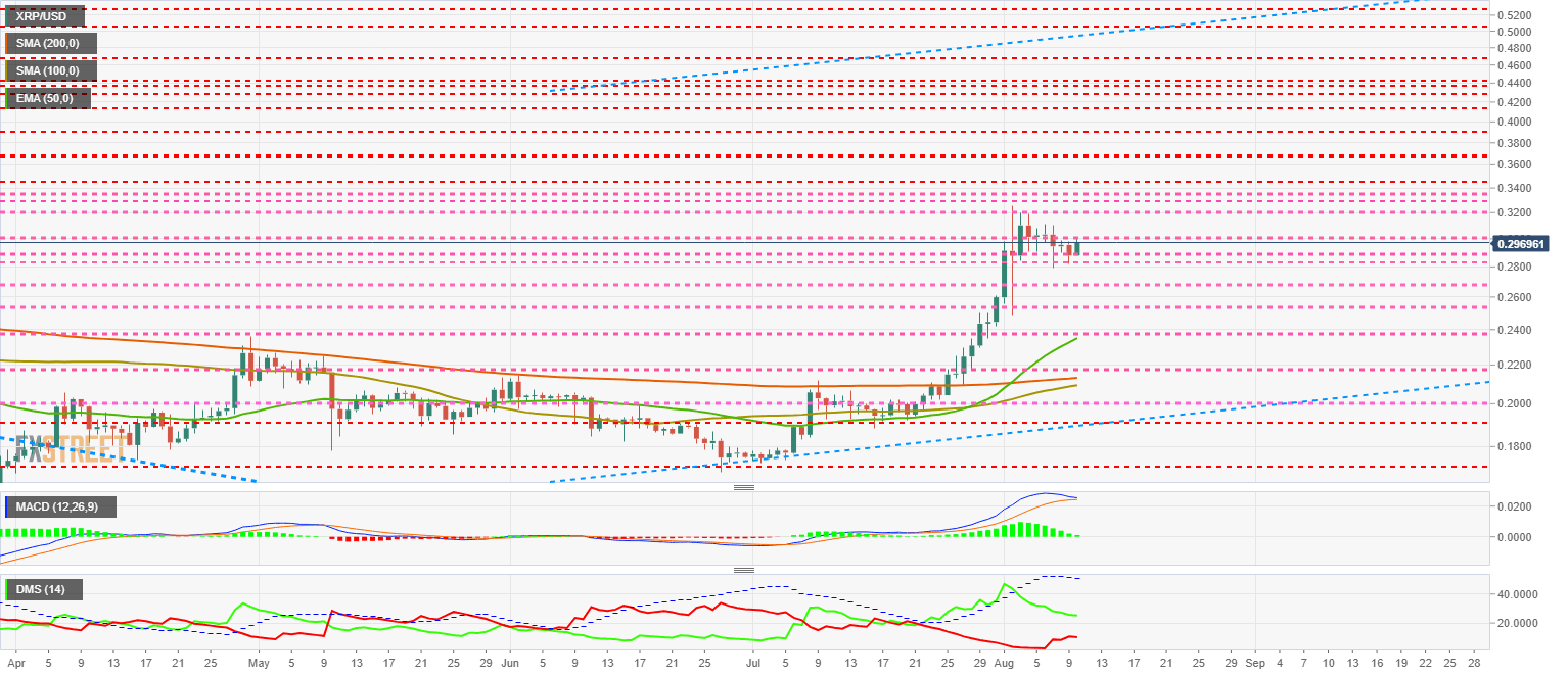 The XRP/USD pair is currently trading at the price level of $0.2999 and is attempting to regain the $0.30 level. The bullish channel projected on the chart places the price target for the current movement above $0.50.