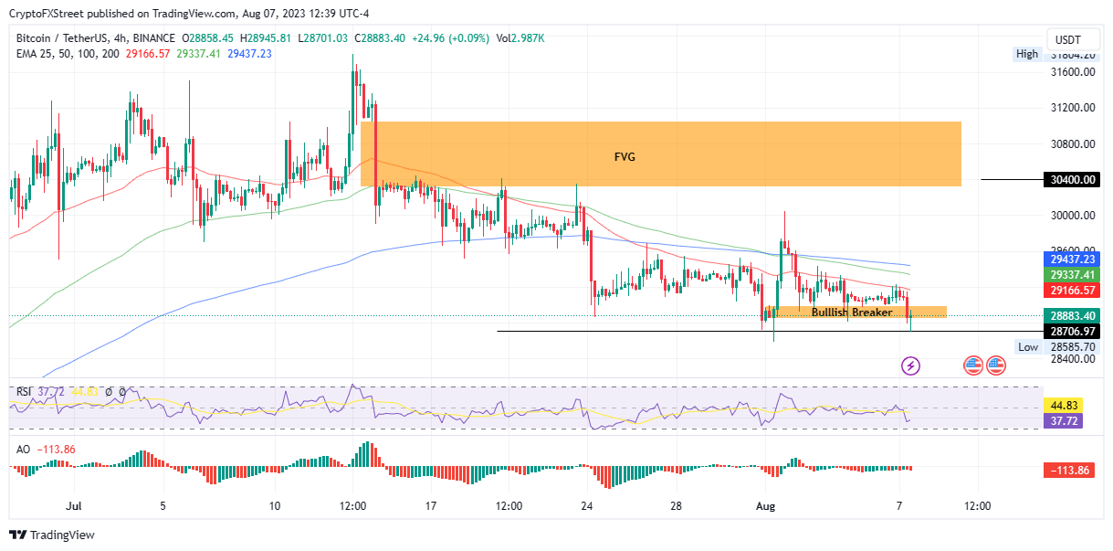 As buying pressure increases from the bullish breaker, Bitcoin price could ascend, potentially breaching the 50-, 100- and 200-day Exponential Moving Averages (EMA) at $29,169, $29,339, and $29,438 levels, respectively. For the layperson, a bullish breaker is a failed demand or supply zone (demand zone in this case).