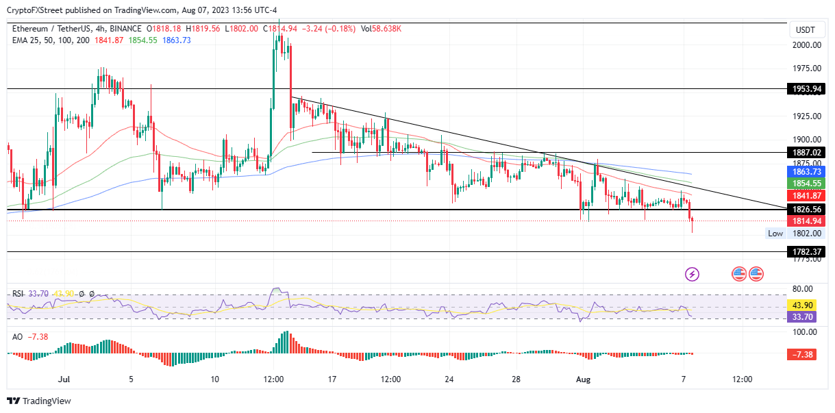 - Ethereum price losing the support at $1,826 means ETH could fall to the $1,782 level as investors exercise caution.