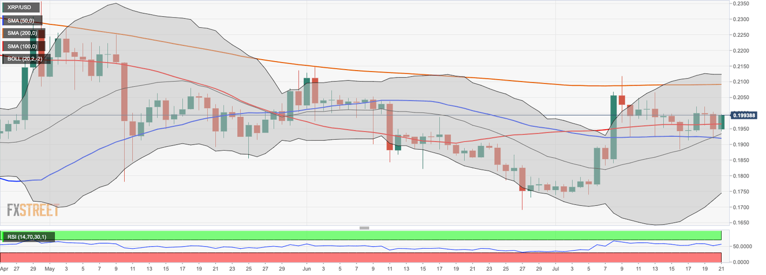 XRP/USD is currently trading at $0.1980. The coin has regained the ground above 100-day SMA that was lost during Monday trading. However, despite the recovery, the price continues moving within the long-term bearish trend from the recent high of $0.2056 (July 9). A sustainable move above $0.2020 (July 19 recovery high) is needed for the upside to gain traction. The 100-day SMA at $0.1965 serves as an initial support level that may slow down the bears and initiate the recovery towards psychological $0.2000 followed by the above-mentioned $0.2020. Once it is out of the way, the upside is likely to gain traction with the next focus on 200-day SMA on approach t0 $0.2100.