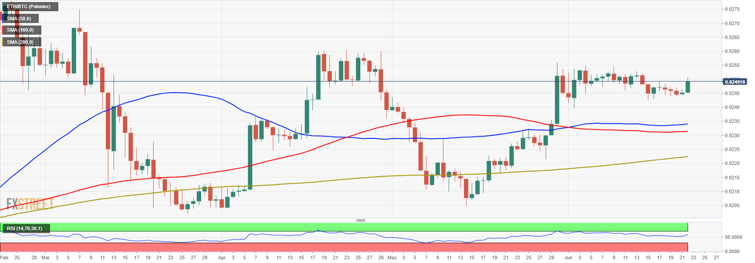 The ETH/BTC pair is currently trading at the price level of 0.0249. The price touched the initial resistance of $0.0250 that needs to be cleared before we can see an extended recovery towards 0.0252 and $0.0255, which is the highest level since May 30. Meanwhile, the local support is created by $0.0244. The second barrier comes at 0.0235, and the third one at 0.025. The RSI on a daily chart points upwards, which implies that the price may continue moving within the bullish scenario.