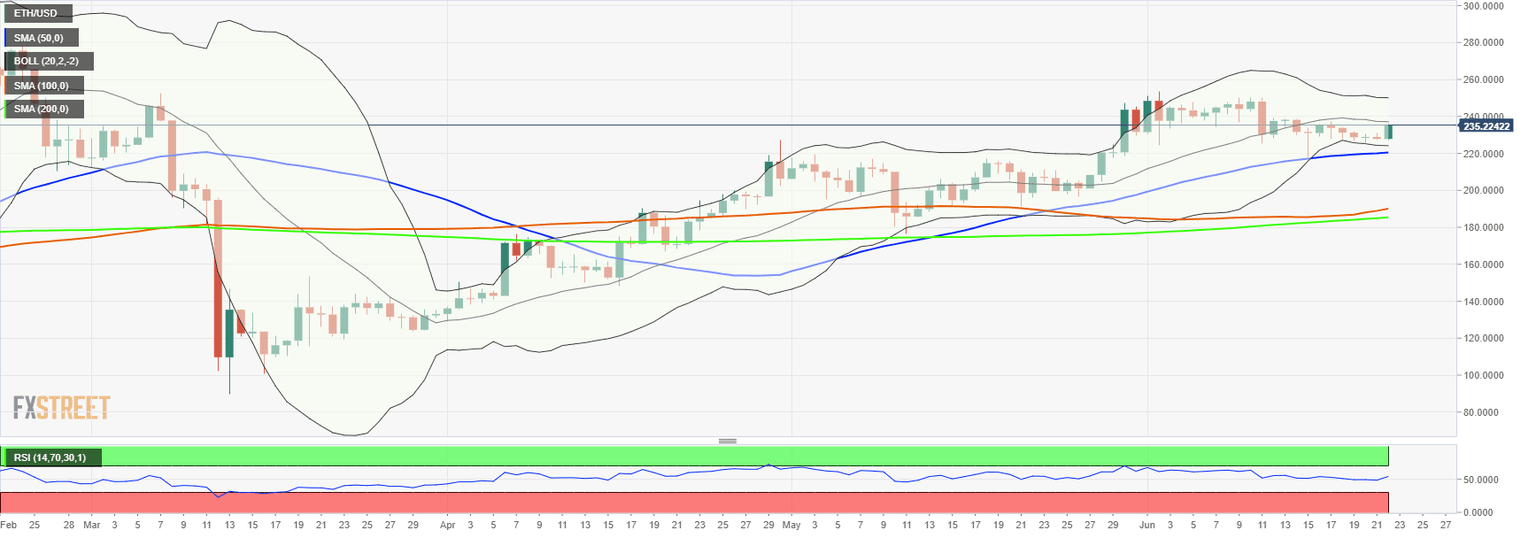 The ETH/USD pair is currently trading at the price level of $234.9 and remains below the critical resistance of $24.00. Above the current price, the first resistance level is at $235, then the second at $240 and the third one at $245. Below the current price, the first support level is at $230, then the second at $220 (daily SMA50) and the third one at $200.